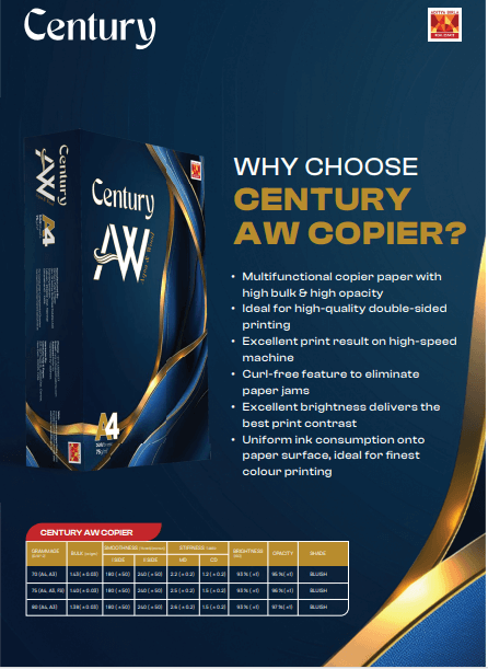 Precision Printing, Every Time – High-Opacity, Curl-Free Paper for Flawless Double-Sided ResultCentury AW Copier, made from wood pulp, is a versatile, high-opacity paper ideal for double-sided printing. It offers smooth, jam-free performance, excellent brightness, and even ink distribution for professional-quality prints.