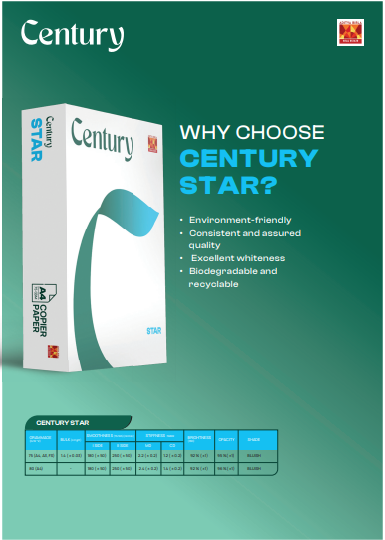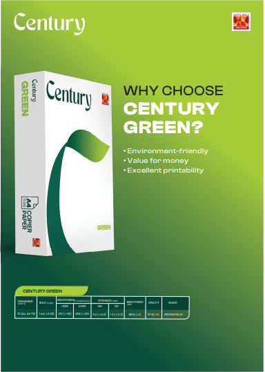 A Greener Future Starts Here – Eco-Friendly Paper Designed for Sustainable SolutionsCentury Green is a sustainable, precision‑engineered paper offering excellent printability, high brightness & reduced ink consumption. Ideal for color printing, it ensures extended document life and eco-friendly value.